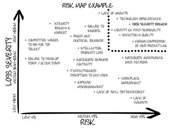 Step 1: List and map your risks. What is the full spectrum of risks that your young and growing firm faces? Many are not obvious at first. Start by listing all the situations where things have gone wrong in the past and all the worries that keep you up at night, from that vice president who cheated on his expense report to the virus that shut down your computers for two days. A good way to get a jump-start on key risks is to obtain a vendor or bank due-diligence list and review their most pressing concerns.